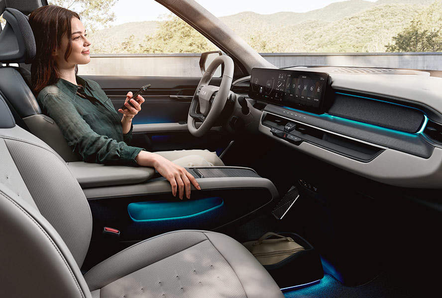 Kia EV9의 인테리어는 미래적이며, 고급스러운 소재와 함께 앰비언트 조명이 통합되어 있습니다. 이 차량은 새로운 비건자 시트를 갖추고 있으며, 이는 모두 동물이 아닌 소재로 만들어져 있습니다. 이 차량의 시트는 편안함을 제공하며, 재료의 품질은 뛰어납니다.