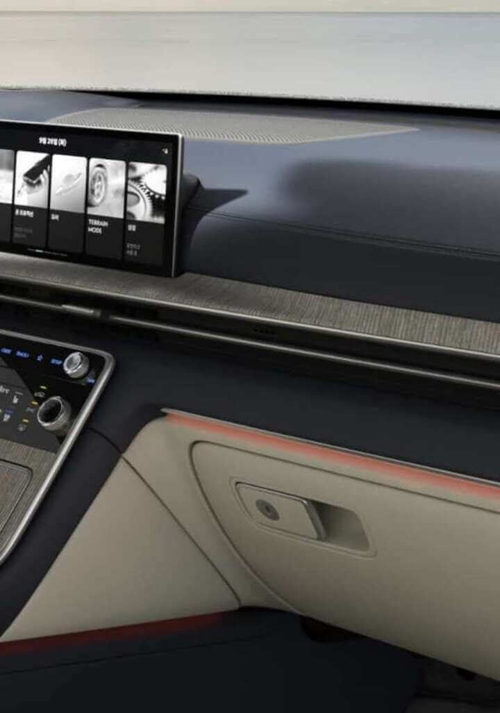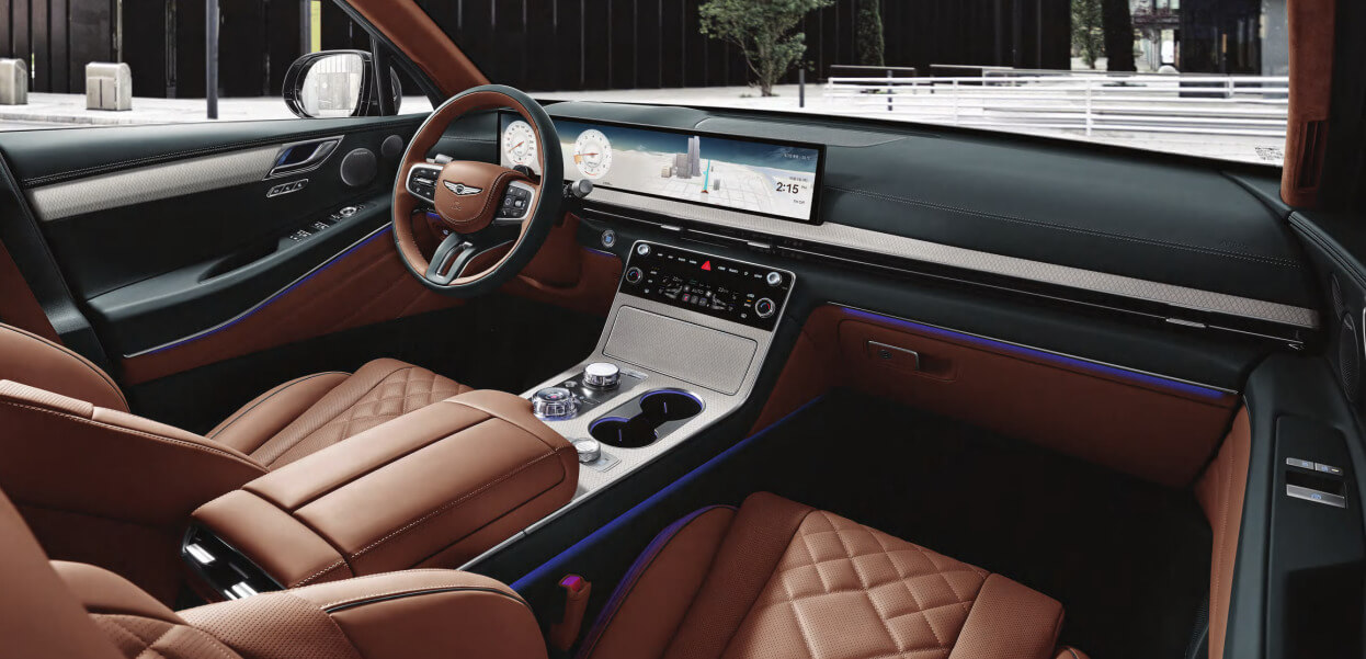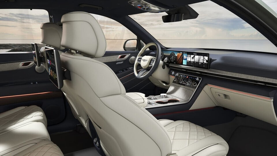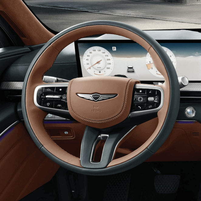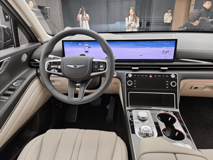 제네시스 GV80 페이스리프트의 인테리어도 새로워졌습니다. 기존에 비판을 받던 럭비공 모양의 스티어링 휠은 신규 3 스포크 스티어링 휠로 바뀌었고, 계기판과 내비게이션은 하나로 연결된 27인치 OLED 파노라믹 커브드 디스플레이가 적용되었어요! 🖥 이로 인해 인테리어가 더욱 세련되고 고급스러워진 것 같아요!